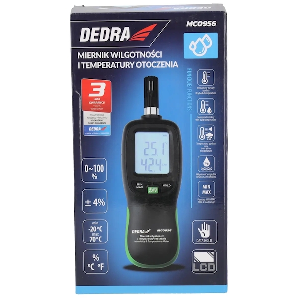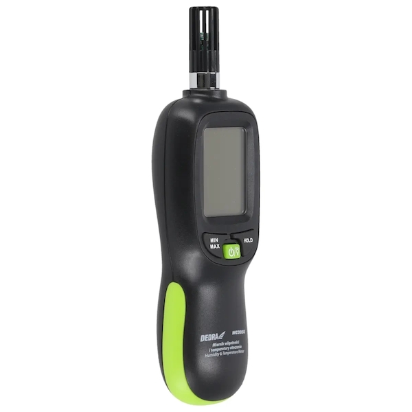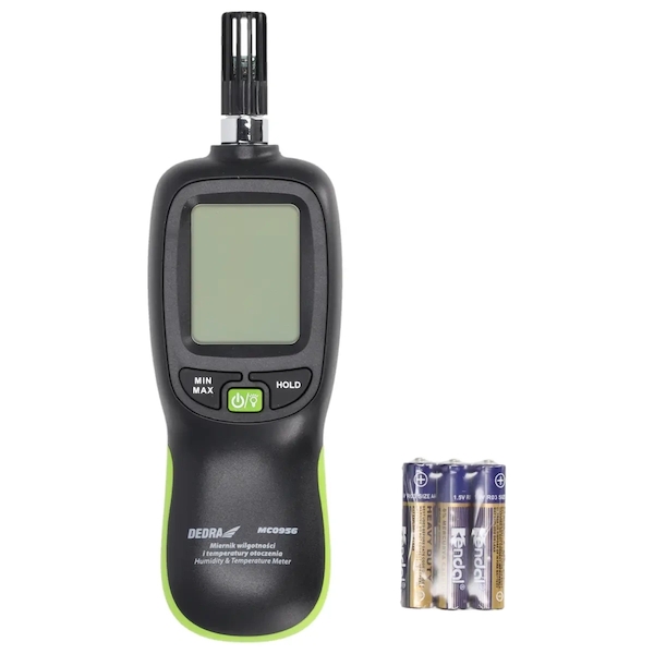 Měřič okolní vlhkosti a teploty DEDRA MC0956 je přístroj, který se používá mimo jiné ve stavebnictví, zemědělství, potravinářství, farmaceutickém průmyslu i při každodenním používání.
